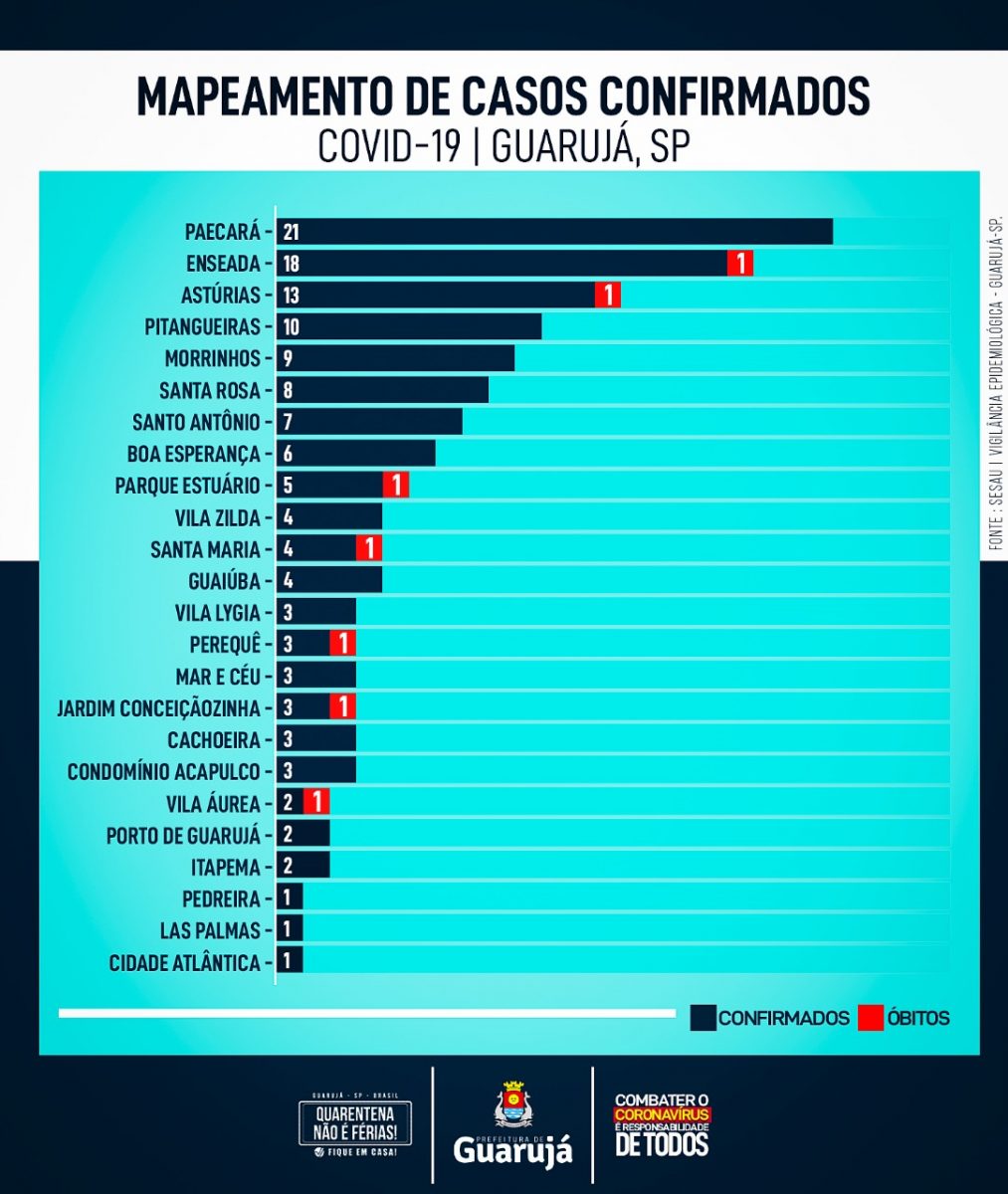 O mapeamento mostrou os bairros onde o coronavÃrus causou mortes. Além de Enseada e Astúrias, Parque Estuário, Jardim Santa Maria, Perequê, Jardim Conceiçãozinha e Vila Ãurea também tiveram vÃtimas da Covid-19, uma em cada um deles.