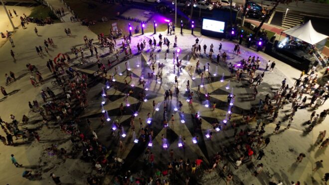 Com luzes e jatos d’água, o equipamento localizado na Praça Tom Jobim – Orla do Gonzaguinha, encantou as milhares de pessoas que contemplaram sua inauguração, seja por lindos sorrisos representados pelos pequenos vicentinos ou pelo genuÃno choro de emoção de um pai ou uma vendo seu filho se divertir tanto ao presenciar a magia da fonte.