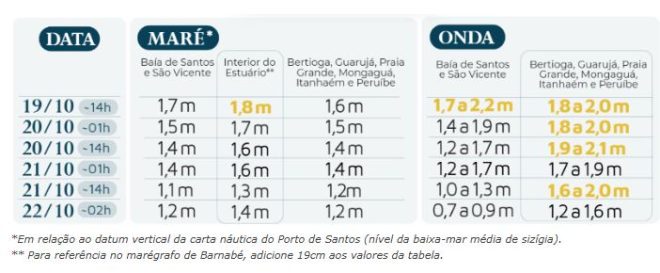 Com relação ao nÃvel do mar, a maré poderá alcançar 1,7m em toda a região de orla da Baixada Santista e 1,8m no interior do Estuário (Santos, São Vicente e Cubatão), com altura máxima prevista para este domingo (19/10) à s 14h, representando aumento de até 25cm em relação à tábua de marés (Tabela 1, Figura 2).
