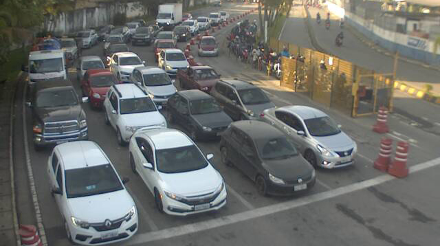 Nesta segunda-feira (27), a travessia Santos/Guarujá opera com sete embarcações. O tempo de embarque é de 15 minutos de ambos os lados, vistos hoje, às 08h34.