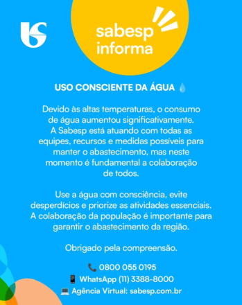 A companhia permanece à disposição dos clientes pelos canais de atendimento: ligue gratuitamente para 0800 055 0195 ou envie uma mensagem de texto para o WhatsApp oficial no número 11 3388-8000 ou acione a Agência Virtual pelo site www.sabesp.com.br.