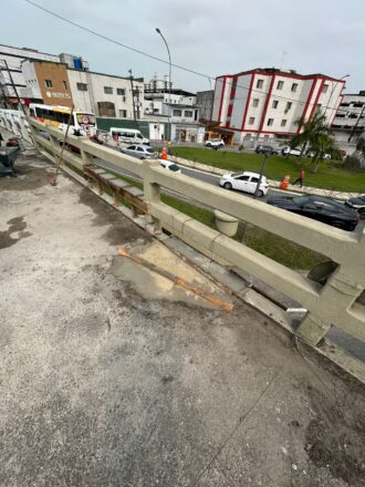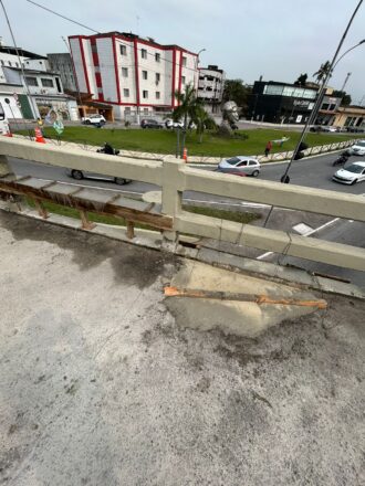 Um acidente ocorrido em maio deste ano, no Viaduto Valdemar José Mancini, entre as avenidas Mallet e Presidente Costa e Silva, no bairro Boqueirão, em Praia Grande, derrubou parte da mureta onde passam pedestres.