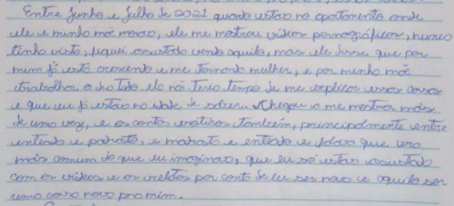 De acordo com a carta, a primeira violação aconteceu em 2021, quando ela morava com a avó e foi até a casa onde a mãe dela e o padrasto moravam. “Entre junho e julho de 2021, quando eu estava no apartamento onde ele e minha mãe moravam, ele me mostrou vídeos de pornografia. Eu nunca tinha visto e fiquei assustada com aquilo. Ele me disse que, por estar crescendo e me tornando mulher, (além) da minha mãe trabalhar o dia todo e não ter tempo de me explicar essas coisas, eu já estava na idade de saber”, relatou no texto. Ela também disse que ele apresentava contos eróticos para elas, além de outros vídeos com pornografia.