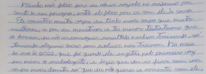 Ainda na carta, a jovem diz que fazia academia e o PM sempre a levava. Ele elogiava o corpo dela e dizia que “ela tinha mais corpo que muitas mulheres” e que ela deveria tomar testosterona. “Comentava que eu tinha mais corpo do que muitas mulheres, e por eu menstruar e ter menos testosterona que o homem, não iria conseguir resultado nenhum só treinando”. Segundo a menina, ele chegou a injetar o hormônio duas vezes nela e que ela não poderia parar de tomar, senão “o corpo ficaria cheio de estrias, celulites, espinhas e queda de cabelo.”