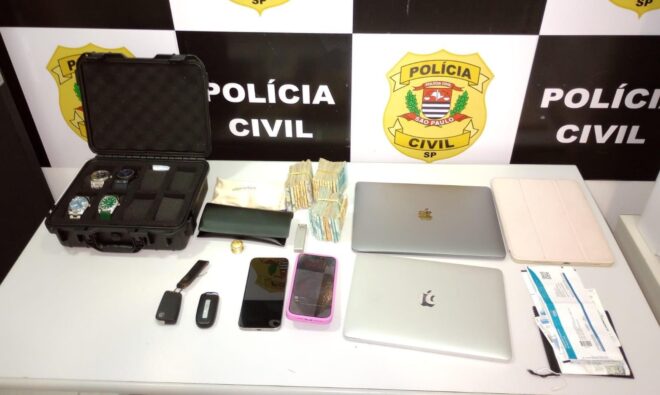 Até agora, dois veículos de luxo, avaliados em quase R$ 330 mil, quatro relógios, seis celulares, três notebooks, R$ 33,2 mil em espécie e diversos documentos foram apreendidos na ação.