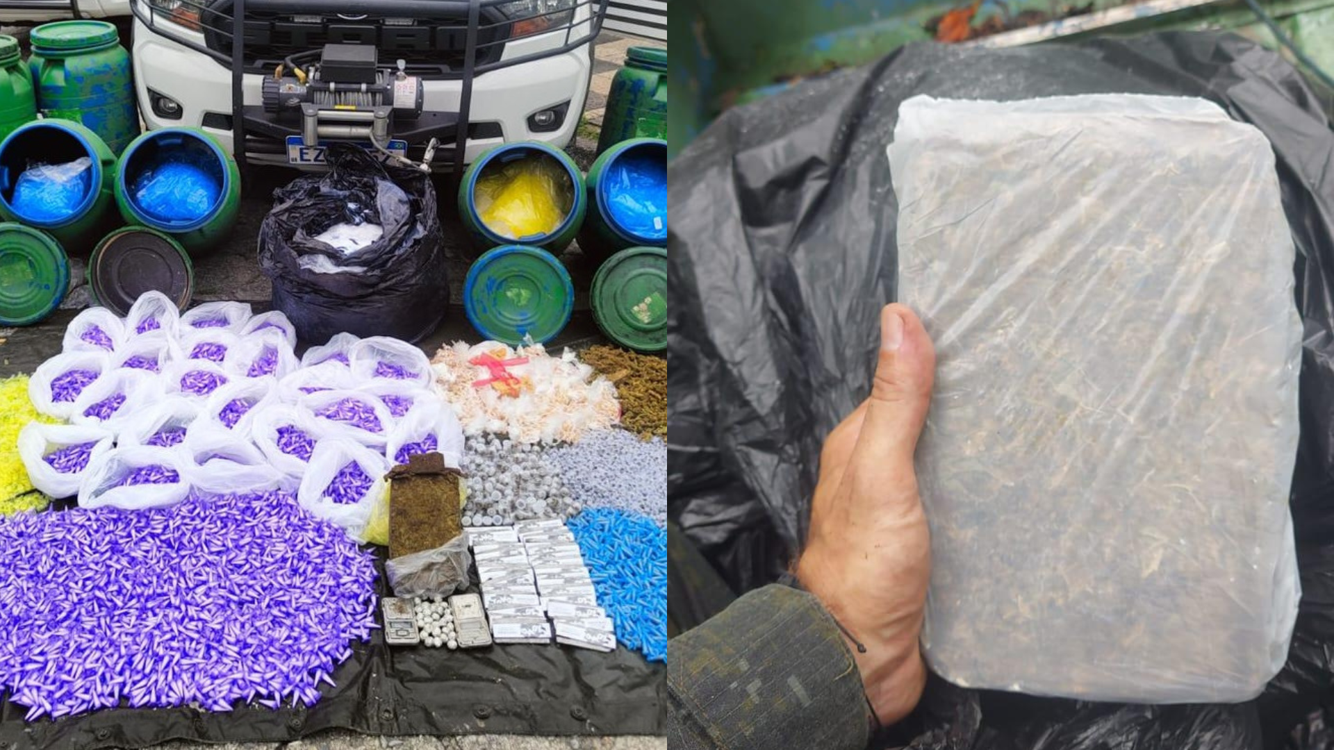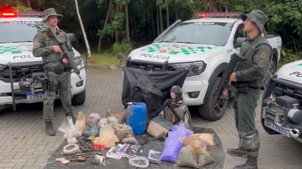 Os entorpecentes estavam em barris. O local era usado como esconderijo pelo crime organizado; mais de 1,7 mil porções de droga foram apreendidas, além de uma arma falsa.