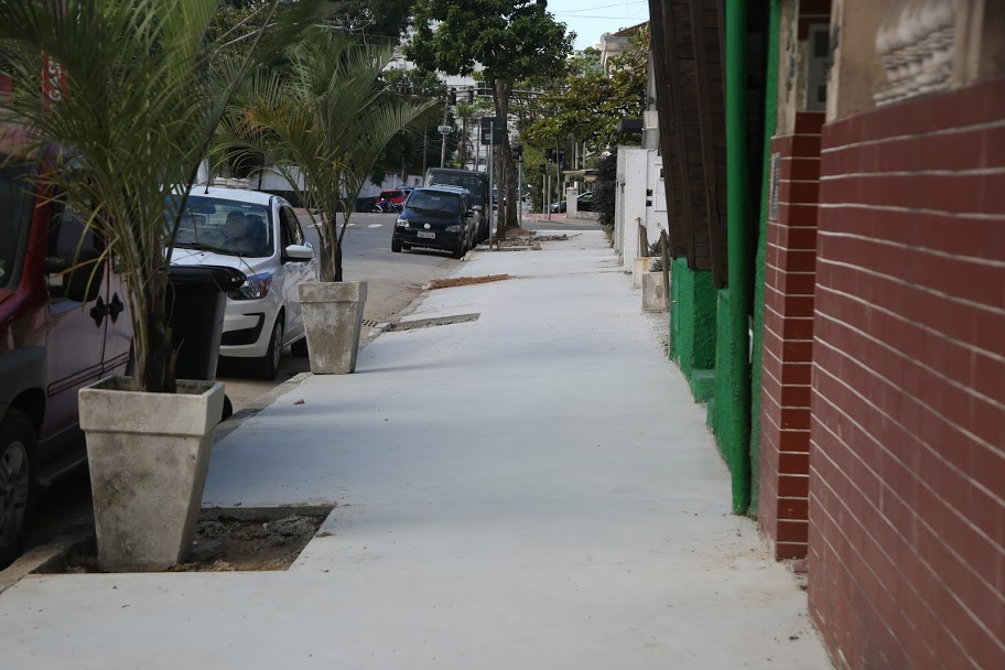“A reforma dos passeios segue o padrão Calçada para Todos, respeitando a divisão por faixas, na proporção de 1/3 de faixa de serviço e 2/3 de faixa livre”, diz o arquiteto Glaucus Farinello. “Na área destinada à faixa de serviço, são implantados canteiros com grama e o piso da faixa livre é executado em concreto desempenado”.
