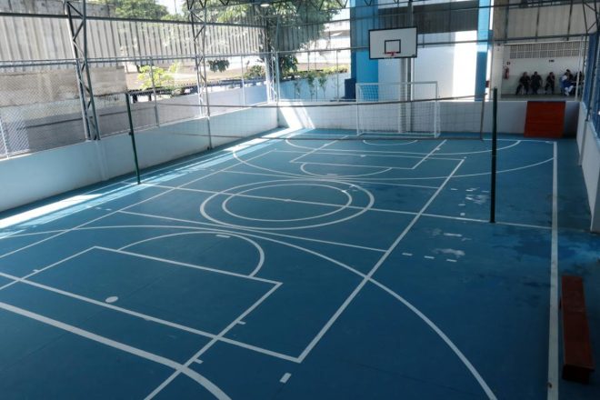 A quadra poliesportiva ganhou vestiário feminino e masculino e depósito de material esportivo. A nova quadra recebeu as luminárias em LED na estrutura superior, Sistema de Proteção contra Descargas Atmosféricas (SPDA), instalação de alambrado entre mureta e fechamento lateral.