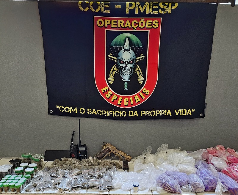 Na região, foram encontrados 3,6 mil pinos de cocaína, 170 pedras de crack, 77 papelotes de skunk e 86 de maconha, além de celular e rádios comunicadores.